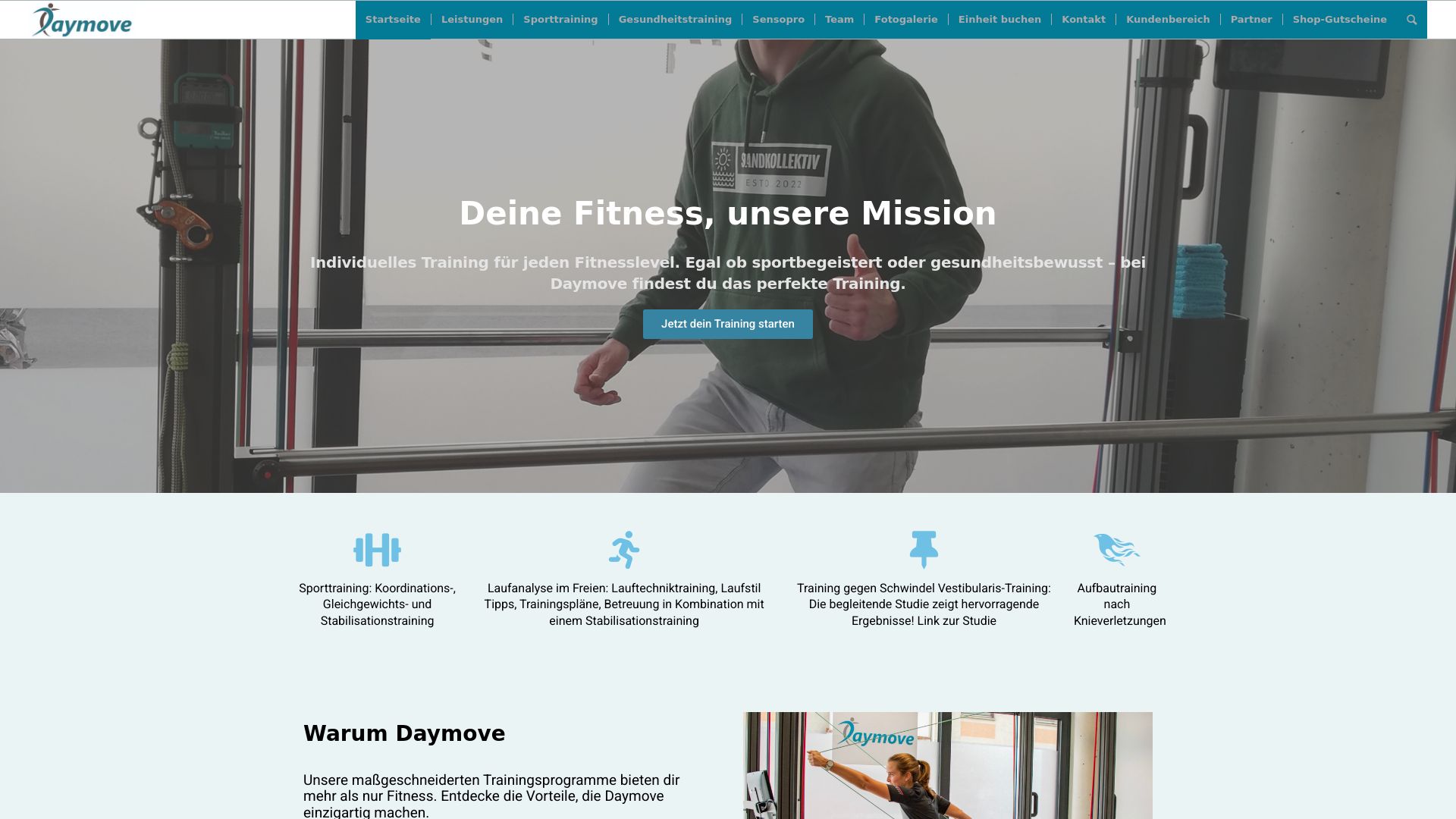 Koordinations-, Gleichgewichts- und Stabilisationstraining soll ein Bestandteil jedes Trainingsplans sein. Sportartspezifisches Ergänzungstraining mit hoher Intensität und Gesundheitstraining, sowie Aufbautraining nach Verletzungen und ein Schwindelspezialtraining werden im Daymove für alle Leistung