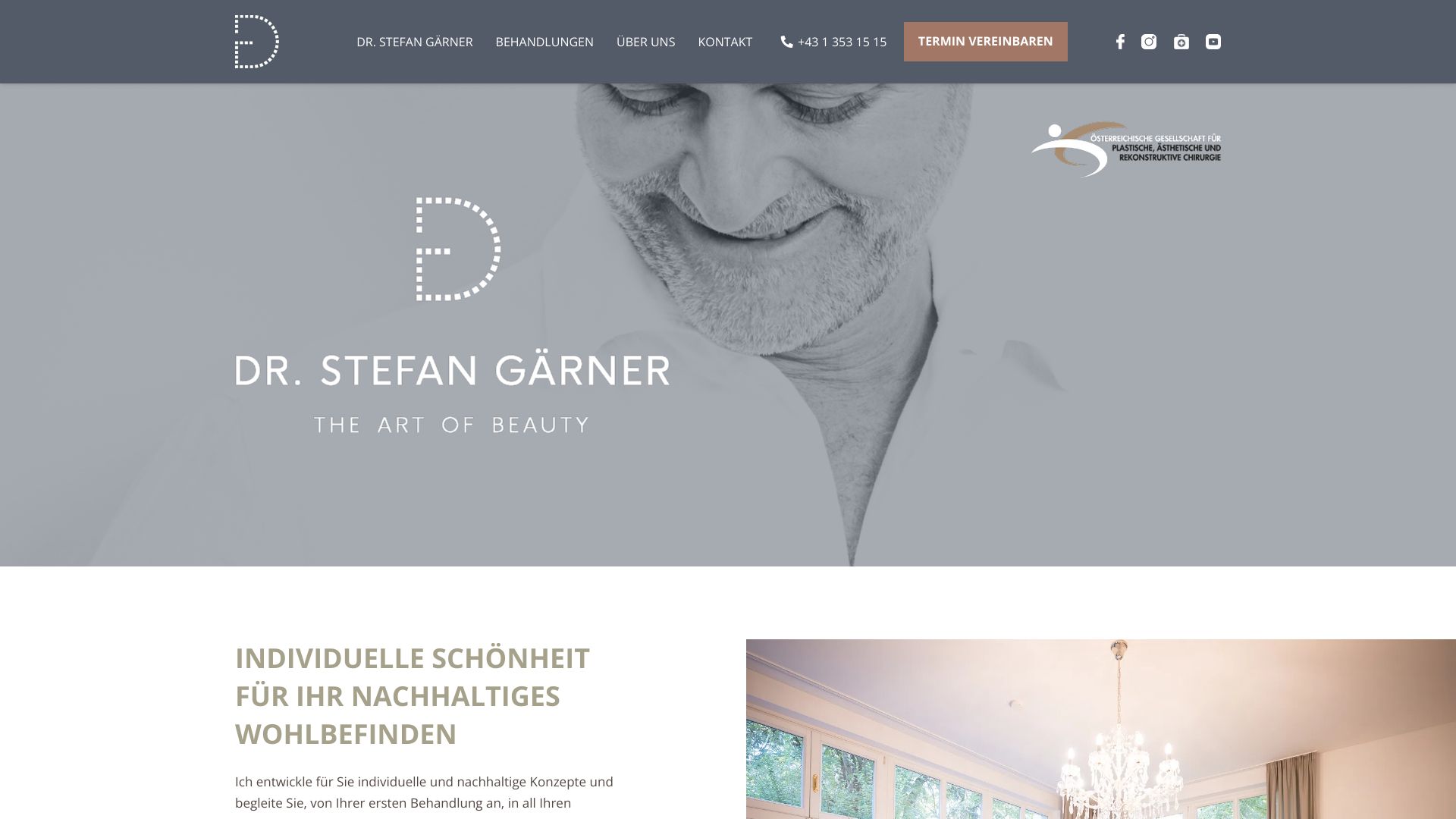 Dr. Stefan Gärner ist Facharzt für Plastische, Ästhetische und Rekonstruktive Chirurgie. Die Ordination von Dr. Stefan Gärner befindet sich in Wien. Es werden Behandlung im Bereich des Gesichts, der Brust, Hand und des gesamtes Körpers angeboten. Ebenso Behandlungen mit Laser, Filler und Botox.
