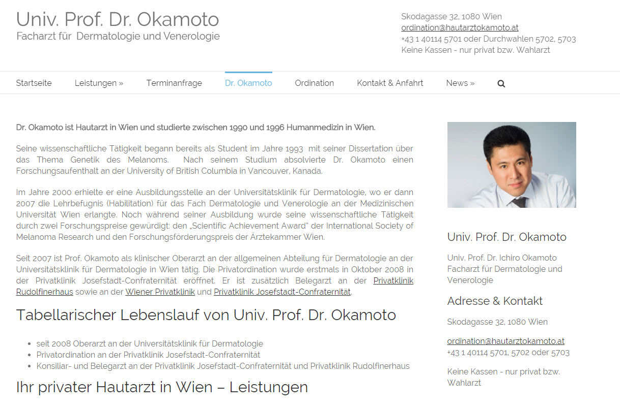 Univ. Prof. Dr. Ichiro Okamoto ist Hautarzt in Wien , Facharzt für Dermatologie und Venerologie und berät Sie bei Hautproblemen aller Art. Er ist Ihr Ansprechpartner für Melanomdiagnose und Muttermalkontrolle inkl. Langzeitkontrolle mittels Auflichtmikroskopie und bietet Hautkrebs-Behandlungen sowie