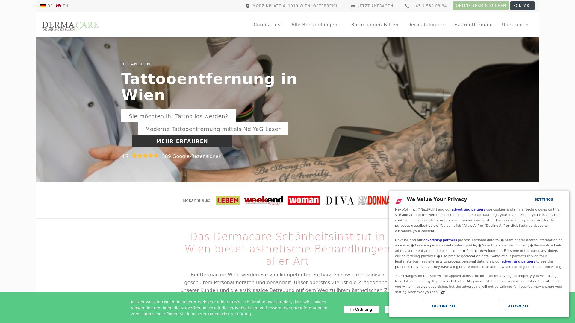 Das Schönheitsinstitut Dermacare im 1. Wiener Gemeindebezirk bietet eine Reihe von Schönheitsbehandlungen an, wie zum Beispiel: Haarentfernung mit Laser Tattooentfernung mit Laser Varizen und Krampfadern entfernen Micro-Needling mit Dermaroller Faltenunterspritzung Fruchtsäurepeelings Jetzt neu! Auf