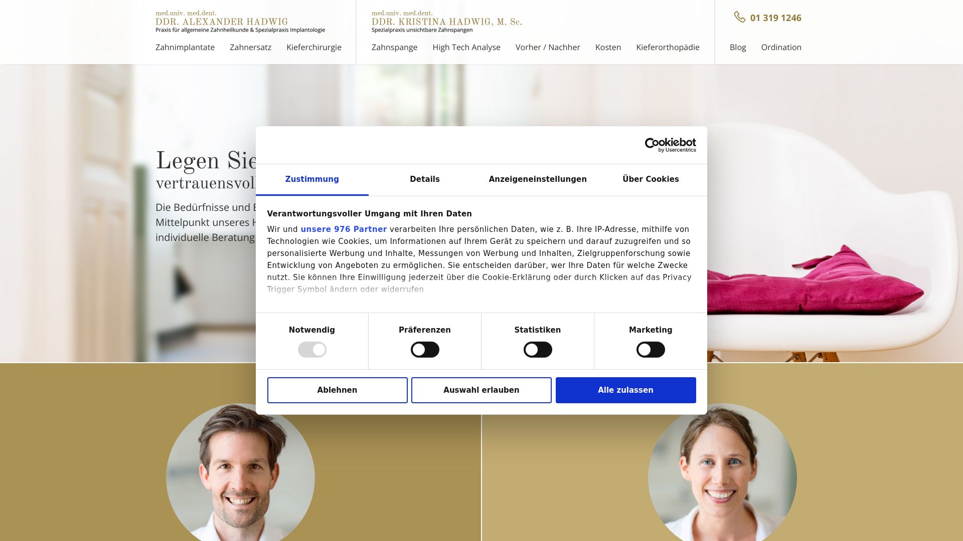 Zahnarztpraxis im 9. Wiener Bezirk von DDr. Alexander Hadwig und DDr. Kristina Hadwig. Die Praxis ist spezialisiert auf Implantologie und unsichtbare Zahnspangen.
