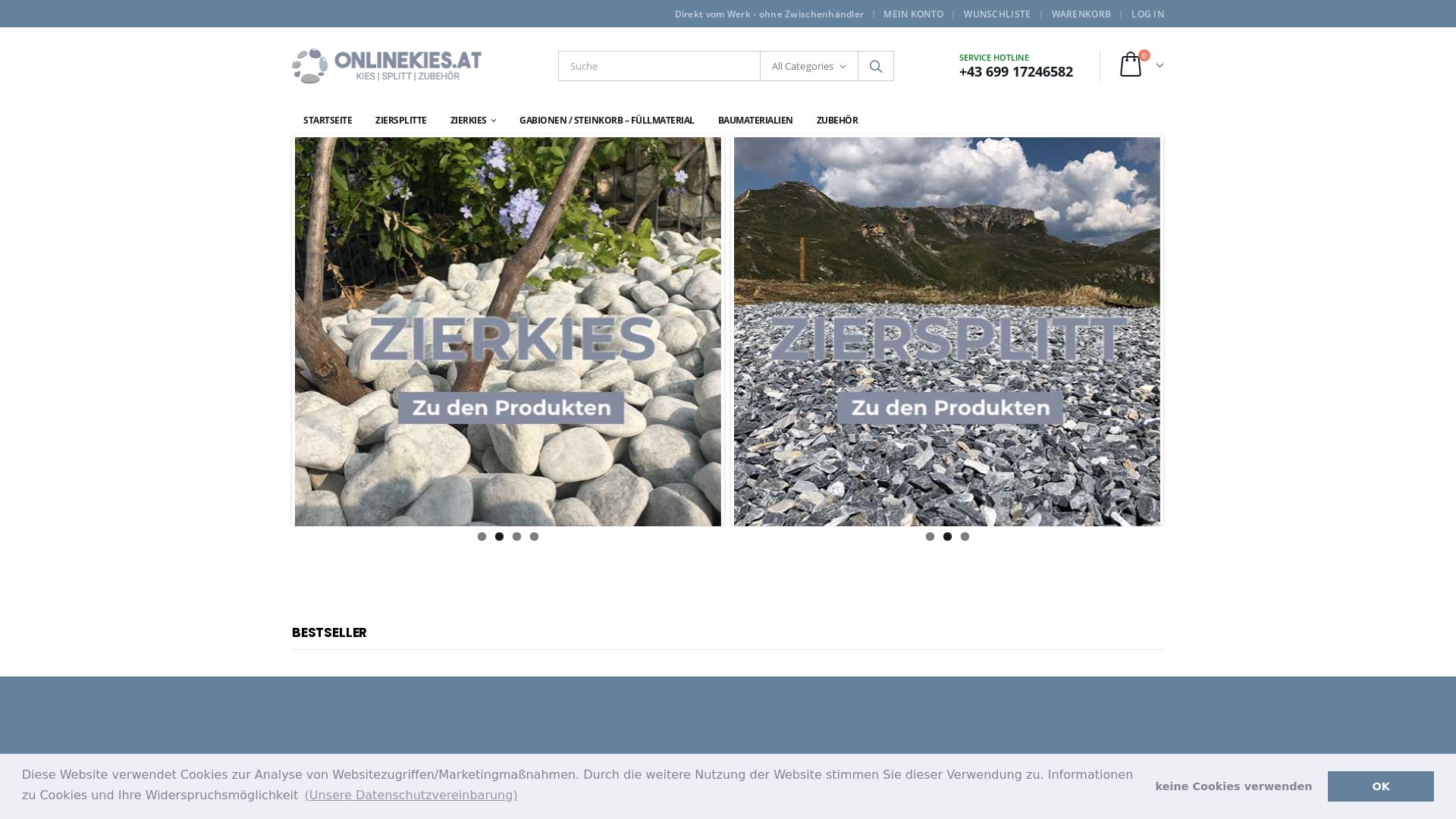 Die OnlineKies GmbH hat sich spezialisiert auf Zierkiese, Ziersplitte, Gabionensteine, Baumaterial und mehr. Die Ware wird in Bigbags zu je 500kg und 1000kg direkt zu Ihnen Nachhause geliefert.