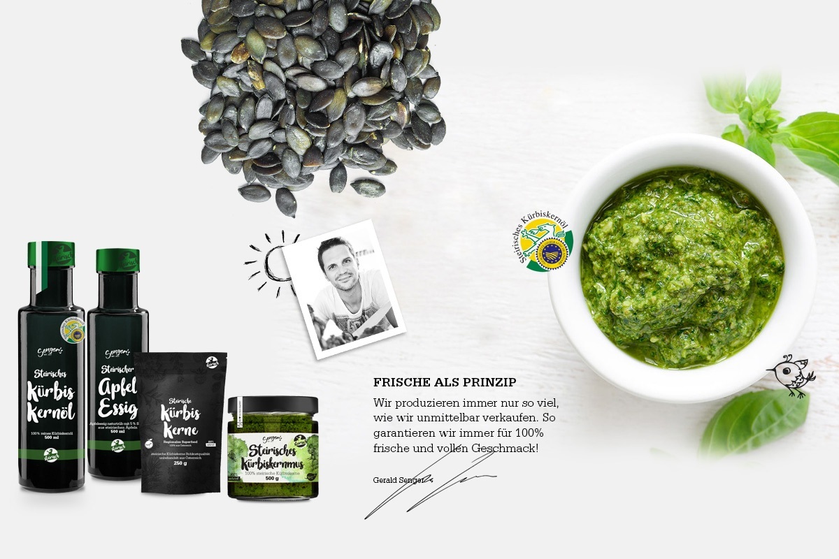 Senger's Genussmanufaktur Wir sind eine kleine familiärer Manufaktur aus der wunderschönen Südsteiermark mit dem Ziel die wunderbaren Produkte unserer Region in die Welt zu tragen. Vom original steirischen Kürbiskernöl g.g.A. über Käferbohnen g.U. bis hin zu unseren wunderbaren Gewürzen entstehen so