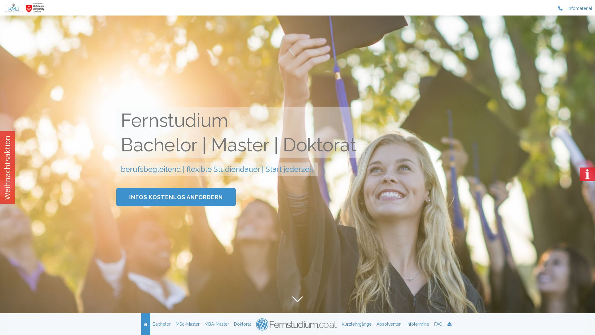 Wir bieten Ihnen in Kooperation mit der KMU Akademie & Management AG anerkannte Fernstudien, von BSc, MSc, MBA bis über DBA, an. Alle Studiengänge finden in deutscher Sprache an der renommierten Londoner Middlesex University online statt. Alle Studien sind flexibel und außerdem nebenberuflich ge