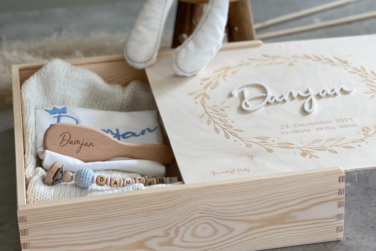 Nachhaltige Babygeschenke zur Geburt oder Taufe. Personalisierte Babygeschenke Österreich. Erinnerungskiste Baby, Schnullerkette mit Namen und personalisierte Geschenke für jeden Anlass.