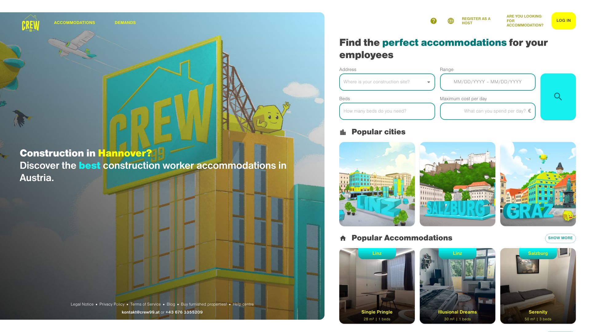 Die Crew99 übernimmt Ferienwohnungen in Linz von Eigentümern, vermittelt diese an potenzielle Firmen und kümmert sich anhand einer All-Inklusive Betreuung um die Mieter rund um die Uhr. Crew99 vermittelt Unterkünfte, Monteurzimmer in Linz, Traun, Pasching, Leonding, Urfahr, Wilhering und Eferding. D